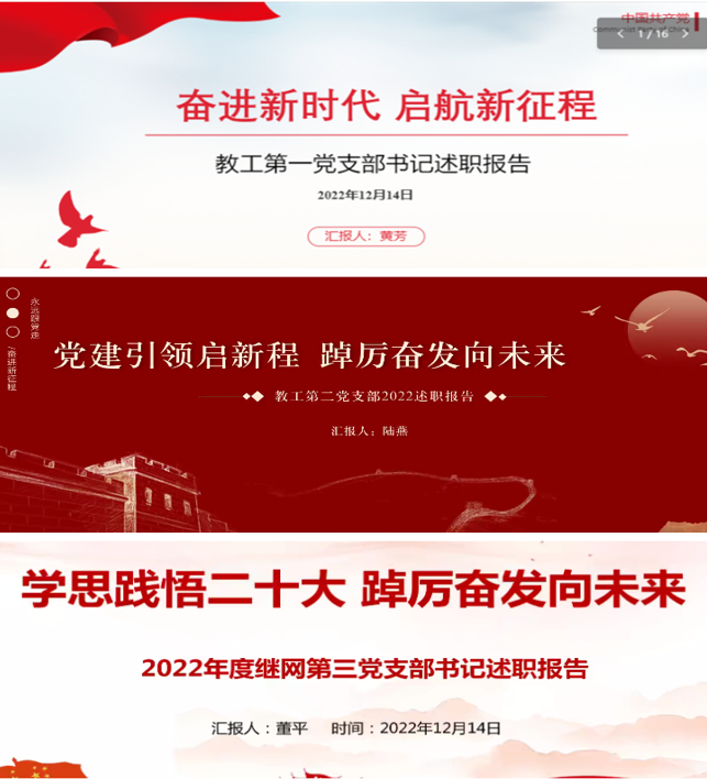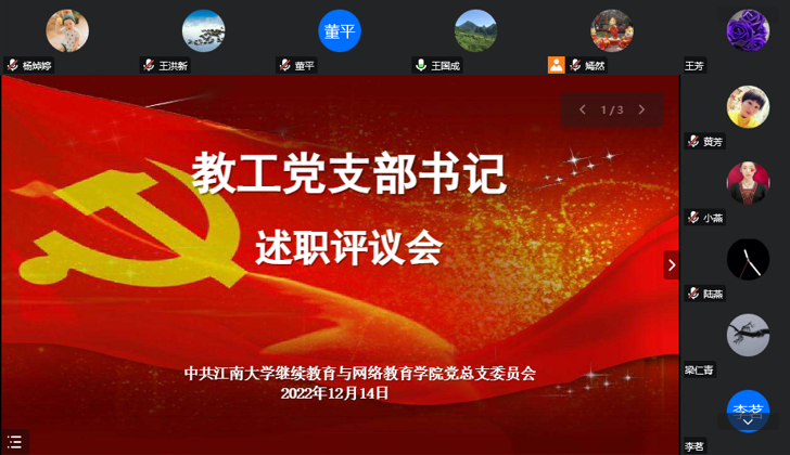 | 12月14日下午,继网公司党总支召开教工党支部书记述职评议会议,本次会议以线上会议形式召开。继网公司党总支委员、专职组织员、各教工党支部书记和委员、党员代表参加了会议。会议由继网公司党总支书记王国成同志主持。 首先,教工第一党支部书记黄芳以“奋进新时代 启航新征程”为主题作了述职报告。她从抓责任担当,促党建工作落实、抓学习教育,促思想境界提升、抓意识形态,促纪律作风建设、工作中存在的问题及加强和改进工作的措施等四个方面进行总结。继网公司张文副经理和王小燕副经理作为公司总支委员对教工第一党支部进行点评。张文同志对教工一支部一年来的党建工作给予了充分肯定,他提出两点希望,一要在理论学习上进一步加强,只有理论上的清醒才有政治上的坚定,要学深、学透,做到真学、真信、真懂,知性行统一;二要学以致用,进一步思考支部组织生活如何与业务工作有机结合起来,避免党务工作与业务工作两张皮的现象,做到学思用贯通,达到相互提高、相互促进的作用。王小燕同志表示,一支部氛围和谐,支部书记和委员精心策划学习内容、学习形式,做了很多工作。她希望今后支委多倾听基层党员的意见,怎么学、学什么,不要为了学而学,丰富学习形式,寓教于乐,进一步提高支部凝聚力。 其次,教工第二党支部书记陆燕以“党建引领启新程 踔厉奋发向未来”为主题作了述职报告。她从全面贯彻党的二十大精神,落实新时代党建总要求、抓紧抓实党员思想建设,不断提高组织工作质量、促进党建业务融合发展,增强支部战斗堡垒作用、不忘初心坚定理想信念,牢记使命履行工作职责、检视不足查找存在问题,拓宽思路创新工作方法等五个方面进行总结。继网公司李剑副经理作为公司总支委员对教工第二党支部进行点评。李剑同志提出三点希望,一要加强政治理论学习,把理论学习的精神观点观念运用到工作实践中,确保理论学习的成效;二要加强与校内职能部门、校外合作单位之间的横向互动,加强沟通交流,更好地推动业务工作,发挥党建力量;三要加强公司教工党支部之间的共建活动,提升公司部门之间同志之间的纽带关系,使职工队伍的凝聚力、战斗力进一步提高,推动公司发展。  再次,教工第三党支部书记董平以“学思践悟二十大 踔厉奋发向未来”为主题作了述职报告。她从党支部组织设置情况、强化党建引领,落实组织制度、加强政治引领,优化党员队伍建设、强化党建引领,落实立德树人根本任务、提质增效,积极落实工作任务、工作中存在问题及整改措施等六个方面进行总结。继网公司经理王洪新作为公司总支委员对教工第三党支部进行点评。王洪新同志对教工三支部一年来的工作给予充分肯定,他指出支部党员和全体职工克服疫情及网络教育停招的各种困难,正常开展各项工作。同时他希望,今后一段时间支部仍要把停招之后各项教学管理服务及收费工作当作首要任务做实做好;创支部特色,创新党员活动的内容和形式,进一步加强党员和普通群众的联系。 公司党总支书记王国成对本次党支部书记述职会议进行了总结点评,肯定了成绩,指出了不足。他指出,各党支部能够认真贯彻落实公司党委和公司党总支的工作部署,坚持政治引领,党支部书记主动抓党建的责任意识有所提升,全面从严治党主体责任意识增强,责任落实进一步牢固,党建工作的整体水平有了较大提高。但在支部标准化建设、特色亮点工作上还有努力的空间,希望各位支部书记,要认真研究吸收各位领导的点评意见,针对陈述中各自指出的问题,加强整改落实。他强调,在今后的工作中:一要强化理论武装,深入贯彻党的二十大精神,推动继续教育高质量发展。二是坚持立德树人,构建全员全过程全方位育人大格局。三是规范人才培养,不断提高人才培养质量。四是加强质量监管,借助数字化工具和手段,实现继续教育办学全过程的可跟踪、可追溯、可评价、可预警。五是要突出特色亮点,在凝练继续教育特色和挖掘亮点上下工夫,加强工作的探索和创新,进一步强化党组织的凝聚力和战斗力。