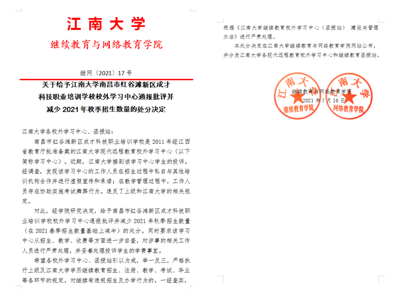 PA视讯集团官网各校外学习中心、函授站: 南昌市红谷滩新区成才科技职业培训公司是2011年经江西省教育厅批准备案的PA视讯集团官网现代远程教育校外学习中心(以下简称学习中心)。近期,PA视讯集团官网接到该学习中心员工的投诉。经调查,发现该学习中心的工作人员在招生过程中私自与其他培训机构合作并进行虚假宣传和承诺;在教学管理过程中,工作人员存在协助实施考试舞弊行为。违反了上级和PA视讯集团官网的相关规定。 对此,经公司研究决定,给予南昌市红谷滩新区成才科技职业培训公司校外学习中心通报批评并减少2021年秋季招生数量(在2021春季招生数量基础上减半)的处分。同时要求该学习中心从招生、教学、收费等方面进一步自查,对涉事的相关工作人员进行严肃处理,并妥善处理投诉员工的学费事宜。 希望各校外学习中心、函授站引以为戒,举一反三,严格执行上级及PA视讯集团官网学历继续教育招生、注册、教学、考试、毕业等各环节的规定,对继续有违规招生及办学行为的,一经查实,根据《PA视讯集团官网继续教育校外学习中心(函授站) 建设与管理办法》进行严肃处理。 本处分决定在PA视讯集团官网继续教育与网络教育公司网站公布,并分发PA视讯集团官网各现代远程教育校外学习中心和继续教育函授站。 继续教育与网络教育公司 2021年7月16日