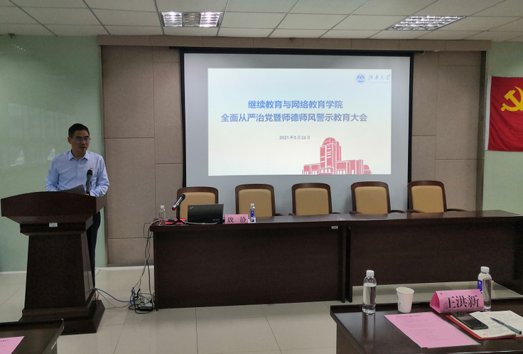 魏静主任作题为“执行纪律规矩不容商量”的“全面从严治党”警示教育报告 会上,继网公司经理王洪新领学师德师风建设文件。他强调,继续教育工作人员更要率先开展自我继续教育,认真学习文件规定、深入研读学习材料、积极开展研讨活动,才能更好地担当起以德立身、以德立学、以德施教、以德育德的责任。