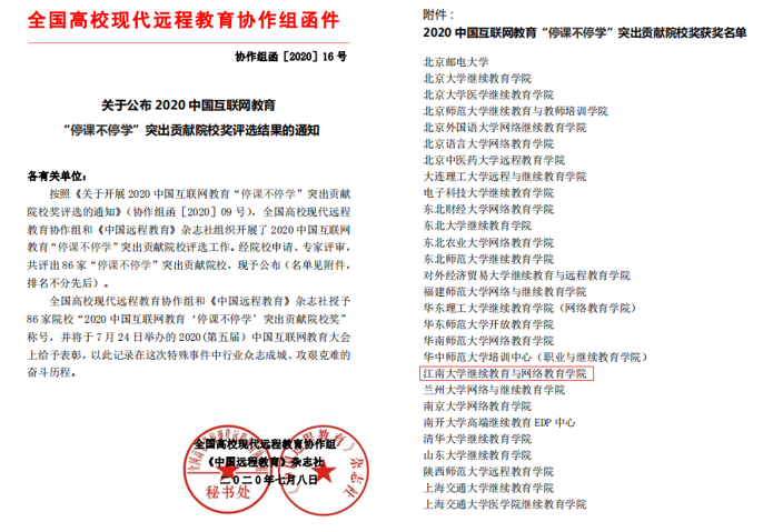 7月24日,由《中国远程教育》杂志社、中国互联网教育领军会主办的2020(第五届)中国互联网教育大会在线上召开。大会以“新趋势、新业态、新格局”为主题,聚焦互联网教育的发展趋势,找寻发展规律。来自各行各业的专家、企业家代表就互联网教育行业关注的问题以及后疫情时代在线教育的深入发展进行了探讨。会中,还对全国高校现代远程教育协作组、《中国远程教育》杂志社组织开展的“2020中国互联网教育‘停课不停学’突出贡献院校奖”进行颁奖。本次评比,在院校申请、专家评审后,共有86家院校脱颖而出,公司继续教育与网络教育公司(以下简称公司)获此殊荣。面对新冠肺炎疫情,公司积极响应国家“停课不停学”号召,发挥现代信息技术与公司产品的融合优势,开拓优质教学资源,积极主动担当,多举措、高效率完成各类教学组织、管理服务工作。公司充分利用“虚拟仿真试验”平台,整合集团一流学科的课程资源,为全日制本科员工提供实验课程远程教学服务;向社会免费开放《食品生物化学》、《食品工程原理》、《综合设计表达》、《教育技术学》等课程资源近500门,满足社会学习者的需求。今后,公司将以此殊荣为动力,进一步规范办学行为,加大优质资源建设与服务支持,提升教学质量,推动继续教育的高质量发展。 |