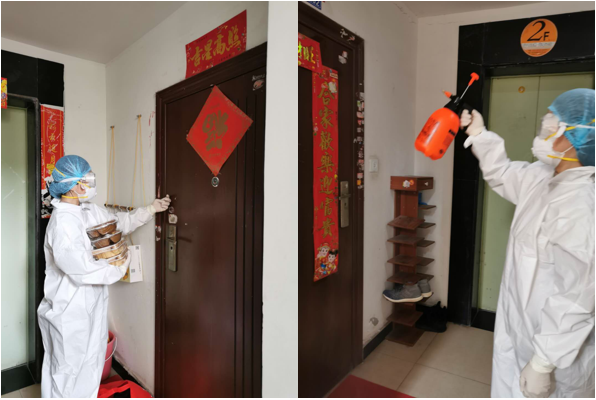 图2:孙艳华同学在给隔离户送饭、做消杀工作 |