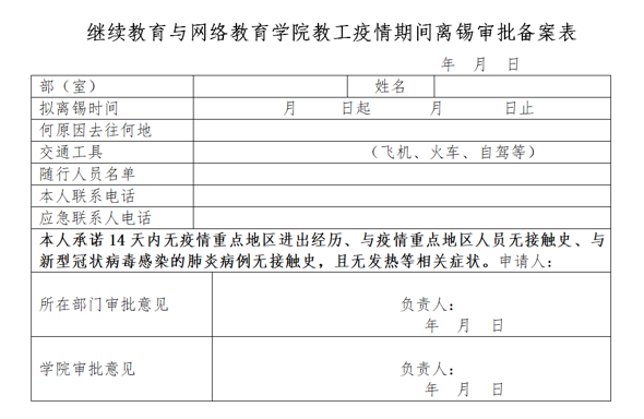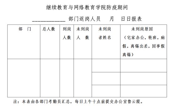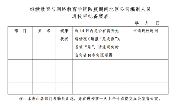 根据上级关于统筹推进公司疫情防控和改革发展,积极做好开学准备工作的要求,经公司应急管理工作领导小组研究决定,根据工作需要,自4月7日(周二)起符合疫情防控健康要求的教职工均可返校到岗工作。现将相关事项和要求提出如下意见: 一、总体要求:公司应急管理工作领导小组要切实履行主体责任,广大教职工要提高政治站位,强化责任意识和纪律意识,根据公司和公司关于返校到岗工作要求,统筹推进防控和加快新学期各项工作的正常开展。 二、基本原则: 1、根据公司《关于教职工有序返校返岗进一步做好开学前准备工作的通知》要求,自无锡(含江阴、宜兴)以外地区返校工作的教职工应提前返回无锡并连续居家隔离观察14天,期间无发热、咳嗽等呼吸道异常症状,“返校通”健康码显示为绿色后方可进入校内开展工作。 2、自4月7日(周二)起,由公司各部门根据实际工作需要,与分管院领导协商自主安排上报本部门员工返岗工作,实行防疫期间“**部门返岗人员日报表”(附件1)制,作为年终个人绩效考核参考之一。 三、进校信息核验: 根据公司防疫工作需要,集团编制人员进校时在公司东大门或北大门核验“返校通”返校码,测量体温,体温正常方可进校。在北区办公的公司编制人员在未获得“返校通”前,防疫期间实行提前一天填报“北区公司编制人员进校审批备案表”(附件2)制,备案经公司主管部门同意后,进校时在集团东大门核验身份证、签字、测量体温,体温正常方可进校。在南区(大学科技园楼宇)办公的公司编制人员暂不进校,需要沟通解决的问题由北区工作人员至南区工作场地研讨。 四、校内防护要求:所有教职工应做好个人防护,在校内食堂、会议室等人员聚集场所应佩戴口罩。 五、严格离锡审批:在疫情未得到有效控制之前,教职工原则上不得离开无锡。确有需要,须提前向公司审批备案(附件3)。 六、防控物资调配:口罩、消毒液等防控物资由行政办公室根据返岗工作人员情况统一提前调配发放。联系人:石克煌、鲁云霞。 七、应急处置准备:应急管理工作小组坚持“日报告”“零报告”制度。教职工需在“返校通”每日填报家属健康状况,特别是有无境外回来的家属情况。教职工如发现身体有异常情况,请第一时间向公司报告并联系校医院(医疗应急24小时电话:0510-85910552,13376235349),启动应急处置预案。 八、履行诚信承诺:教职工返校前按要求注册“返校通”并每日填报,确保填报信息真实准确,行政办公室负责做好提醒工作。对自身身体健康状况及行程故意瞒报、漏报、不报的,一经查实,将予以严肃处理。返校返岗教职工不得擅自携带家属、子女和校外人员进入校园。 九、防疫日报制度:各部门考勤员负责每日填报“部门到岗人员日报表”(附件1)和“北区公司编人员进校审批备案表”(附件2),并于每天上午十点前汇总至党、政办公室,联系人:丁晓嫣、鲁云霞。 特此通知。 附件1:继续教育与网络教育公司防疫期间**部门返岗人员日报表 附件2:继续教育与网络教育公司防疫期间北区公司编人员进校审批备案表 附件3:继续教育与网络教育公司教工疫情期间离锡审批备案表 继续教育与网络教育公司应急管理工作领导小组 2020年4月4日 附件1: