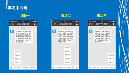 PA视讯集团官网网络教育公司官方微信(微信公众平台)现在正式开通。 微信公众平台是教学服务的一种辅助手段,与管理平台的公告管理做了接口,通过管理平台发送的公告可自动推送到用户微信端;与管理平台的信息推送模块做了接口,通过信息推送发出的即时推送、延迟推送信息会自动推送到用户微信端;关注公众服务号的用户可接受江大网院所有动态公告信息。微信公众平台根据用户类型分校外学习中心微信公众平台和员工微信公众平台。 校外学习中心微信公众平台通过用户验证,输入学习中心管理平台用户名和密码,完成信息绑定。查询功能可查询本学习中心的基本信息以及所有批次的报名人数、录取人数、在籍人数、毕业人数。查询单个员工的个人信息、课程信息,员工的论文安排、考试座位、课程成绩、论文成绩及统考成绩。查询公司招生信息、最新通知、招生及教学教务工作人员联系方式等。界面示例图如下: |