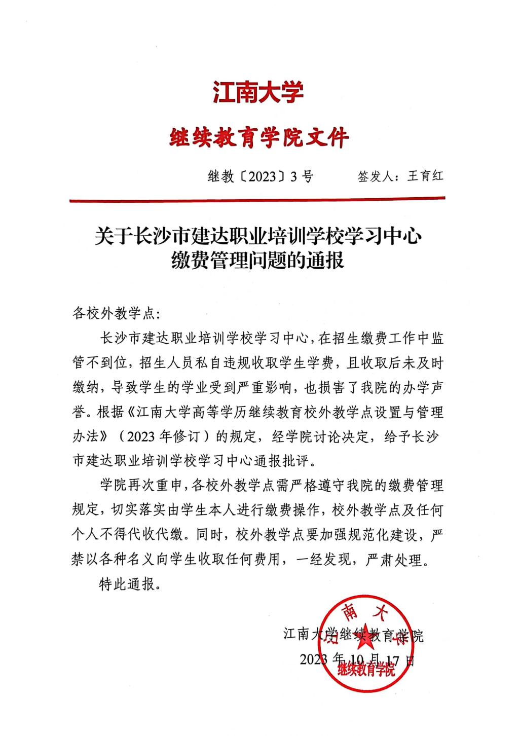 长沙市建达职业培训公司学习中心,在招生缴费工作中监管不到位,招生人员私自违规收取员工学费,且收取后未及时缴纳,导致员工的学业受到严重影响,也损害了公司的办学声誉。根据《PA视讯集团官网高等学历继续教育校外教学点设置与管理办法》(2023年修订)的规定,经公司讨论决定,给予长沙市建达职业培训公司学习中心通报批评。