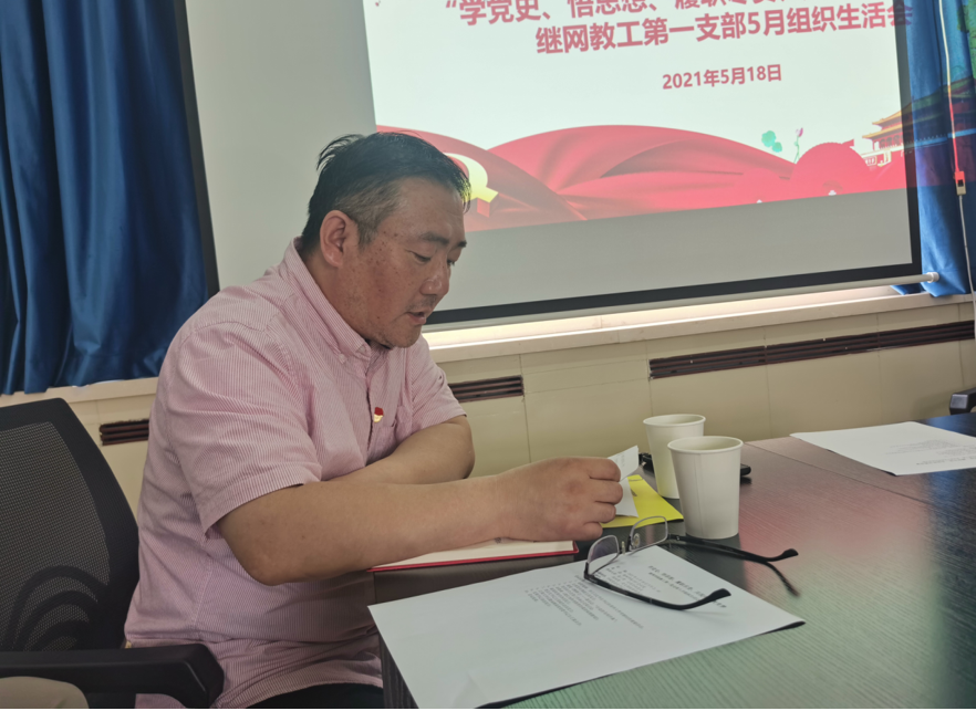 活动现场 党的十九届四中全会提出了构建服务全民终身学习的教育体系,明确了教育治理体系与治理能力现代化的核心价值取向,随后,支部党员成教事业发展部主任荆政同志以“学史明理 努力适应新岗位 把好招生质量关 服务继续教育”为主题作主旨发言。他讲述了自己轮岗到继网公司以后,工作的转变以及自己在工作中的一些体会,他表示,一要认真学习党史,努力锤炼自身政治品格和素养;二要矢志为人民群众服务谋利造福,这是党的初心,也是党的工作的根基;三要强化义不容辞的使命担当感。通过学习党史,我们每一位党员要更加坚定理想信念,牢记初心使命,培养斗争精神,实现接续奋斗;四要扎实做好招生调研工作,把好招生质量关,为公司的成教事业,乃至国家的全民终身教育的事业贡献力量。