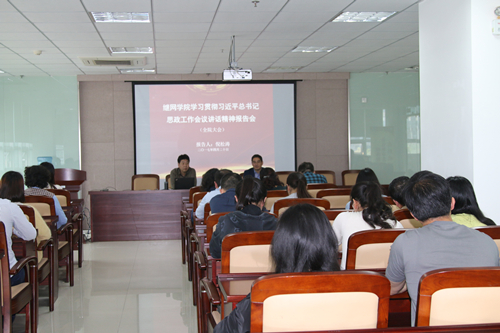 | 为深入贯彻落实习近平总书记在全国高校思想政治工作会议上的重要讲话精神,创新推进新形势下思想政治工作,继续教育与网络教育公司邀请校党委宣传部倪松涛部长于4月20日下午在公司南区三楼会议室向全院教职工做了学习贯彻习近平总书记思政工作会议讲话精神报告会,报告会由继网公司经理兼书记王洪新主持。 首先,倪松涛部长从对思政工作会议意义的认识,对思政工作会议精神的理解,对思政工作会议落实的思考三个方面做了报告。其次,倪部长结合继网公司工作的实际情况,提出继网公司的教职工要提高自身的四种意识,政治意识、管理意识、服务意识、育人意识,最终的契合点是要提高自身的政治意识。要拿起思政教育武器,把握成长成才规律,探索文化积淀路径,守住安全稳定底线。最后,王洪新经理就如何践行全国高校思政工作会议精神,贯彻习近平总书记重要讲话精神,加强和改进思想政治工作,畅谈了自己的体会和意见建议。并提出全院教职工要在思想上高度重视,创新工作方法,加强思政研究,努力做好新形势下的思政工作。