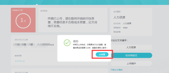 | 各校外学习中心、同学: 202307届毕业论文(设计)的写作已近尾声,请同学们根据指导教师意见认真修改毕业论文(设计),于2023年3月20日-4月2日将电子稿传至平台,纸质稿打印装订后于4月3日前交至所属校外学习中心。 请各校外学习中心务必于4月7日前将有意向参加答辩员工的毕业论文(设计)终稿纸质稿收齐、整理后统一邮寄至公司教学管理部教务办公室。(请按照专业、指导教师分类整理,并附上整理名单)专科毕业作业和不参加论文答辩的毕业论文(设计)请学习中心留档保存。 本科层次员工毕业论文(设计)终稿必须在写作平台先提交论文关键字(如图1所示),之后提交终稿稿件提交查重检测(如图2所示),查重费用自理。 查重检测通过率标准:重复率≤30%。查重未通过的,在规定时间内可再次修改、提交、再次查重,直至查重符合规定要求。查重结果不符合规定要求或未查重的,系统自动评阅为“不及格”等次。       特别提醒: 1、不要随意在不正规网站进行所谓“免费查重”。造成文章泄露后期论文查重无法通过,后果自行承担。 2、只有在写作平台提交的查重检测才是有效的,查重跳转后的页面如图3所示,查重成功如图4所示,其他网站结果均无法返回平台,视为无效。 3、平台跳转查重后,再次点击出现图5所示,若没有跳转,是浏览器将查重界面拦截,请将浏览器取消拦截,30分钟后再次进行查重操作。 4、平台提交查重后,请先自行下载查重报告,等待10-15分钟登陆写作平台查看查重率和查重报告是否返回平台,若没有及时返回平台,请在维普服务QQ群(群号1058546206)及时联系维普工作人员或联系学习中心老师。 5、请同学们确认好稿件再进行终稿上传,重新提交查重需要重新收费。 6、终稿必须要进行查重检测,请各位同学在规定时间内完成,逾期无法查重或查重不通过,将影响毕业。 7、根据教育部公布的《本科毕业论文(设计)抽检办法(试行)》,本科毕业论文抽检每年进行一次,请同学们按要求认真撰写。