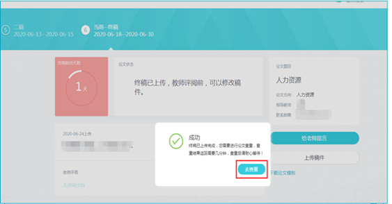 | 各校外学习中心、同学: 202301届毕业论文(设计)的写作已近尾声,请同学们根据指导教师意见认真修改毕业论文(设计),于2022年9月27日-10月8日将电子稿传至平台,纸质稿打印装订后于10月12日前交至所属校外学习中心。 请各校外学习中心务必于10月17日前将有意向参加答辩员工的毕业论文(设计)终稿纸质稿收齐、整理后统一邮寄至网院教学管理部教务办公室。(请按照专业、指导教师分类整理,并附上整理名单)专科毕业作业和不参加论文答辩的毕业论文(设计)请学习中心留档保存。 本科层次员工毕业论文(设计)终稿必须在写作平台提交查重检测(如图1所示),查重费用自理。 查重检测通过率标准:重复率≤30%。查重未通过的,在规定时间内可再次修改、提交、再次查重,直至查重符合规定要求。查重结果不符合规定要求或未查重的,系统自动评阅为“不及格”等次。       特别提醒: 1、不要随意在不正规网站进行所谓“免费查重”。造成文章泄露后期论文查重无法通过,后果自行承担。 2、只有在写作平台提交的查重检测才是有效的,查重跳转后的页面如图2所示,查重成功如图3所示,其他网站结果均无法返回平台,视为无效。 3、平台跳转查重后,再次点击出现图4所示,若没有跳转,是浏览器将查重界面拦截,请将浏览器取消拦截,30分钟后再次进行查重操作。 4、平台提交查重后,请先自行下载查重报告,等待10-15分钟登陆写作平台查看查重率和查重报告是否返回平台,若没有及时返回平台,请在维普服务QQ群(群号1058546206)及时联系维普工作人员或联系学习中心老师。 5、请同学们确认好稿件再进行终稿上传,重新提交查重需要重新收费。 6、终稿必须要进行查重检测,请各位同学在规定时间内完成,逾期无法查重或查重不通过,将影响毕业。 7、根据教育部公布的《本科毕业论文(设计)抽检办法(试行)》,本科毕业论文抽检每年进行一次,请同学们按要求认真撰写。