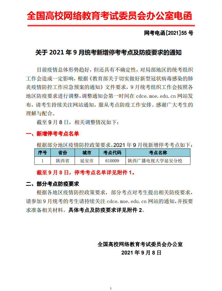 转发“网考电函[2021]55号 关于2021年9月统考新增停考考点及防疫要求的通知” ... ... ...
