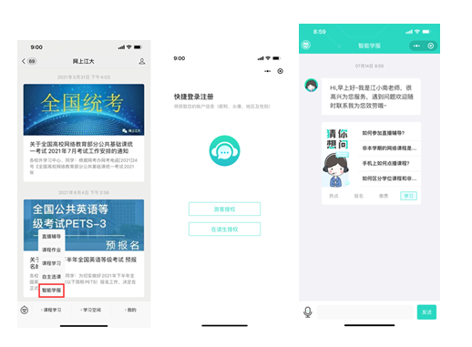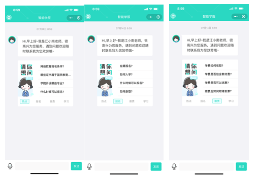 | 江大网院“智能学服”小程序上线                   图/文  夏丹   江大网院“智能学服”小程序上线!江小南老师随时为您解答有关网络教育的相关问题。  “智能学服”小程序采用了语音识别、语义理解等人工智能技术,与在籍员工或游客进行自然流畅的交互。针对想了解江大网院并且有计划报读的员工,该小程序可自主解答关于招生、录取、学习等相关政策;针对已入学的在读生,通过人机交互,员工自主问询关于学籍、缴费、作业、考试、毕业等内容。