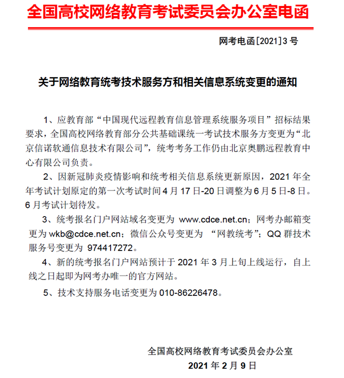 现将网考办《关于网络教育统考技术服务方和相关信息系统变更的通知》 网考电函