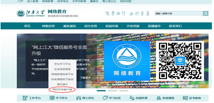 2. 计算机设备要求 计算机操作系统须为win7以上,配备30万像素以上摄像头的台式机或笔记本电脑。 3. 安装说明 安装限时机考客户端前关闭杀毒软件,如弹出提示则选择“允许程序运行”后安装。安装成功后,启用程序会对电脑的联网状态、摄像头、虚拟机、远程控制程序、外接显示器状态等进行自动检测,不合格则需要根据提示对电脑进行设置后重新启动程序;检测合格则启动成功,输入登录账号即可参加考试。 五、考试流程及答题说明 1. 考试前下载并安装“限时机考客户端”(“易考通”客户端)。 2. 打开“易考通”客户端,输入用户名及密码(即员工学习平台用户名及密码)登录。 3. 登录考试系统后在考试列表里课程为本次需要参加考试的课程。选择某一课程参加考试。 4. 检测电脑设备是否符合要求。3道题目按要求作答,检测键盘、鼠标、摄像头是否正常。 5. 身份核验(人脸识别)。进入考试界面前,考生需要进行拍照验证,验证通过则直接进入考试,验证不通过需要重新拍照验证,如果三次不通过,则会提醒考生是否确认是考生本人,点击确认本人即可进入考试,不通过结果反馈给公司,再次进行人工审核。 6.参加考试(答题)。考生考试过程中需全程对准摄像头,期间会不定时进行抓拍照片。 7. 答题说明。(1)客观题作答根据题目要求选择选项。(2)主观题作答则直接录入文字,如主观题作答的答案为特殊公式、表格或作图题时,可采用线下白纸先作答,再通过微信扫描二维码拍照并上传。(3)考试时上网、快捷键、搜索、复制、粘贴等功能不能使用。(4)除填空题外的主观题都可以采用微信扫描二维码拍照并上传。 8.考试结束提交考卷。提交考卷须身份核验,进行拍照验证。开始考试后60分钟后才可提交考卷。 六、考试其他事项 1.考试过程包括考前、考中、考后都进行人脸抓拍核验,考前三次验证审核不通过者再经公司人工审核仍不通过者,本次考试课程成绩记为“0”分。 2. 考试时如若因断电或断网等其他原因造成的考试中断,在120分钟内重新登录继续参加考试,超时将结束本次考试。故考试前考生应确保电源和网络的正常,考试期间不得以断电或网络等原因要求增加考试次数。 3. 考试期间严格按照《PA视讯集团官网网络教育课程考核管理规定》执行,如发生违规违纪行为,按相关规定严肃处理。 七、校外学习中心考试组织要求 1. 各校外学习中心(考点)考前需熟悉整个考试的流程,做好考前宣传和指导工作;考试期间登录管理平台,“集中笔试”菜单栏下“集中笔试机考完成情况查询”查询考生是否完成考试并督促考生在规定时间内完成考试。 2. 为保障每位考生在考试期间都能顺利考试,如有考生无法保证考试的硬件条件,各学习中心(考点)在确保疫情稳定安全的情况下,每个考点配备若干调试好的电脑,供考生考试使用。 3. 严格按照《PA视讯集团官网网络教育课程考核管理规定》的要求组织员工参加考试。   联系电话:0510-85320360。 附件:限时机考操作说明   江大网院教学管理部 2020年5月20日 附件:限时机考操作说明.doc