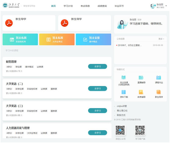 新员工学习平台注重以员工学习为中心,突出员工关心的学习、考试、毕业等问题,以课程学习为主线,融合平时作业、阶段练习、直播辅导、浏览课件等功能,同时平时布置的作业及考试均在首页突出位置显示,辅助学习功能也以快捷方式列于首页,便于员工边学习,边完成作业练习。