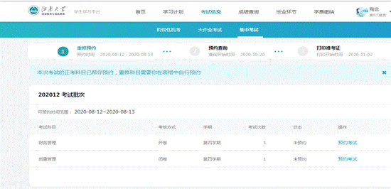 大作业考试和阶段性机考的课程无需预约,可直接参加学习和考试。需要缴纳重修费的课程,需先进行重修课程办理再至“学费缴纳”菜单栏下缴纳重修费之后才能继续进行学习和考试。