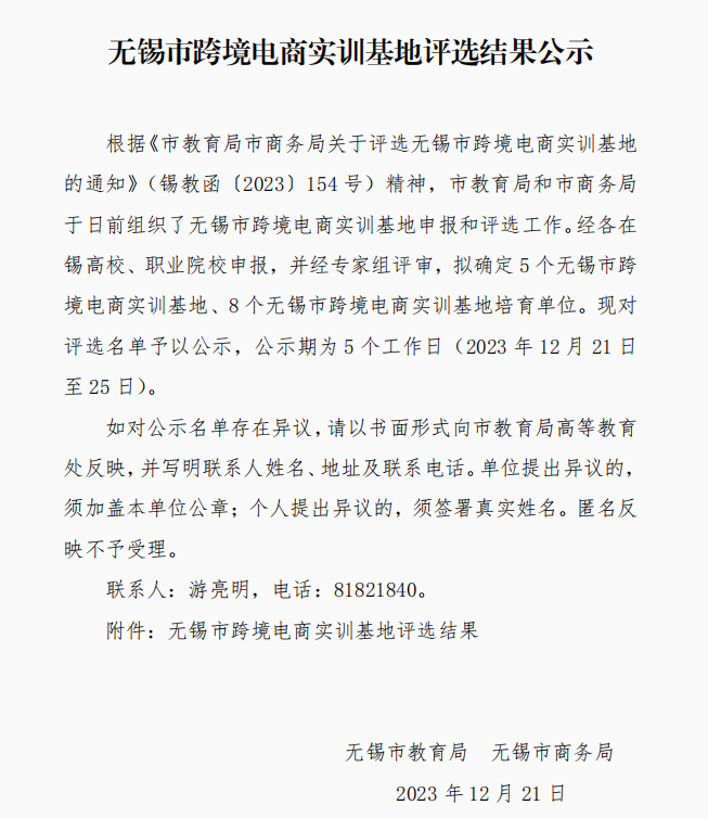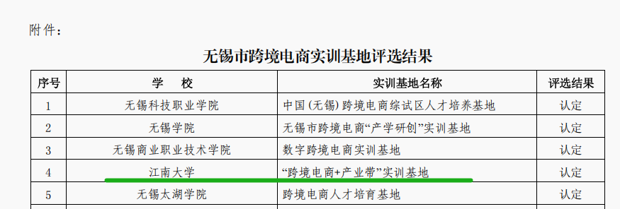 为加强在锡高校、职业院校跨境电商实训基地现代化建设水平,提高跨境电商人才培养质量,根据《中国(无锡)跨境电子商务综合试验区高质量发展三年行动计划(2022-2024年)》锡政办发[2022]16号)和《中国(无锡)跨境电子商务综合试验区 2023年重点工作》等文件精神,无锡市教育局、无锡市商务局联合发文决定在全市高校、职业院校评选一批无锡市跨境电商实训基地。在此次基地申报中,公司申报的无锡市“跨境电商+产业带”实训基地成功入围第一批认定基地。