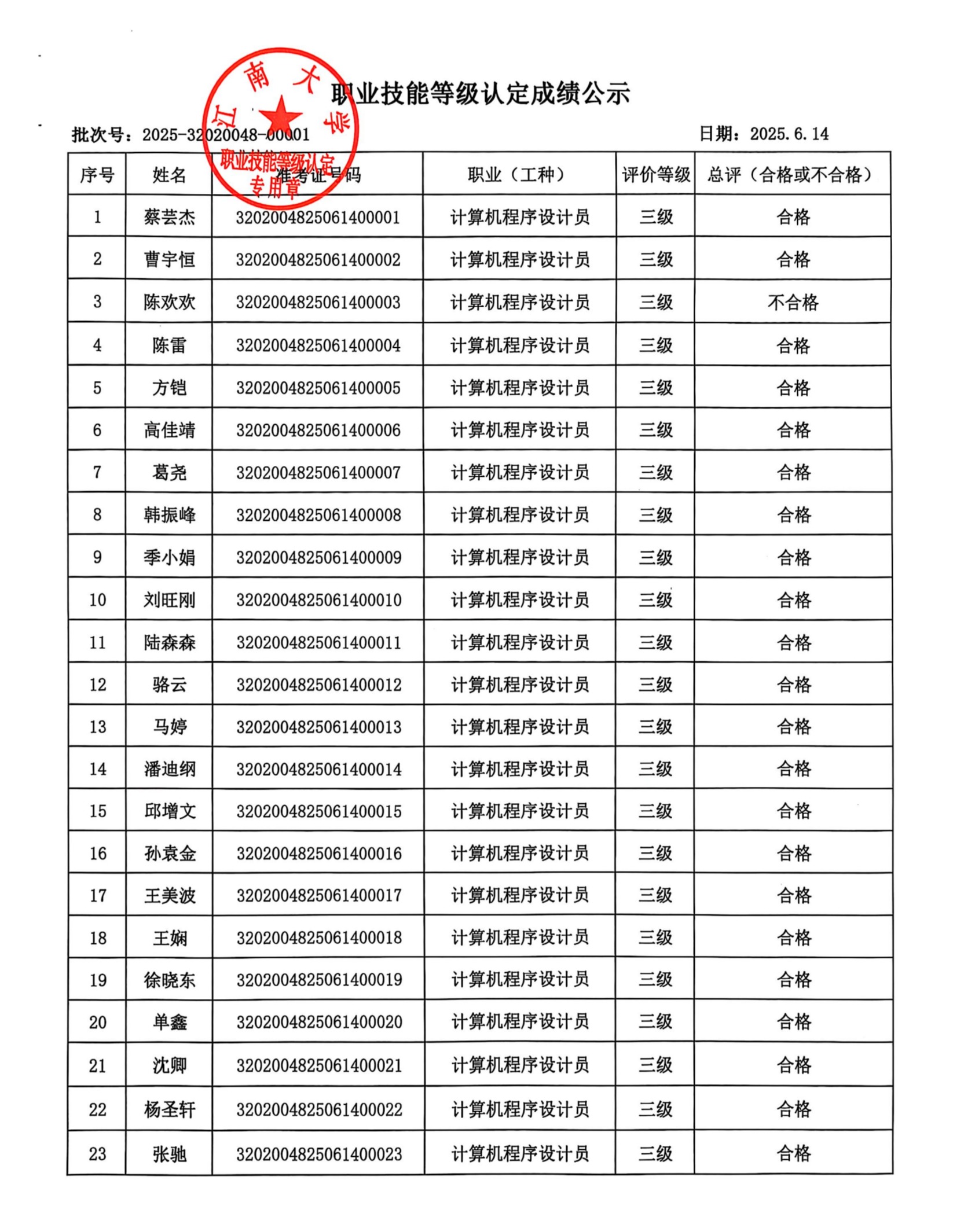 公示时间:2025年6月18至2025年6月23日。公示期间有疑问请联系PA视讯集团官网职业技能等级认定中心,联系电话:0510-85813033。