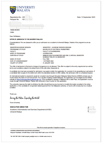 4.员工签证批准后,在通知书规定的注册时间内,前往马来亚大学办理新生注册手续,开始本科阶段的学习。